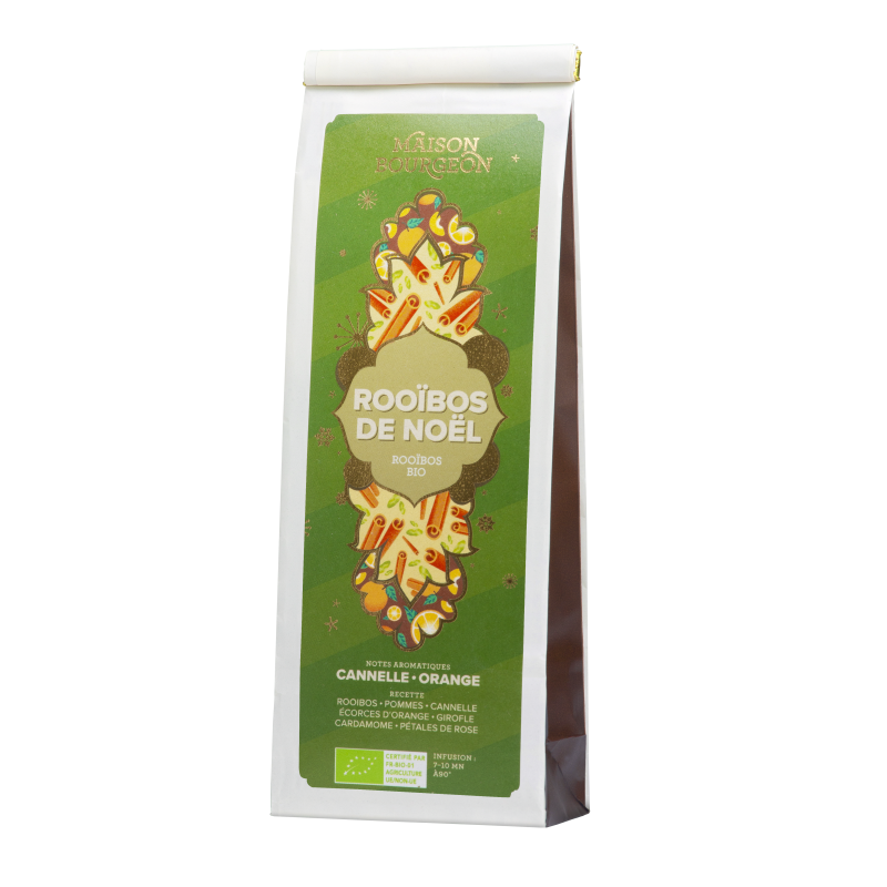 Rooibos de Noël bio de Maison Bourgeon, infusion sans théine aux saveurs réconfortantes de cannelle et d'orange. Mélange gourmand avec morceaux de pomme, épices et écorces d'agrumes. Une boisson idéale pour l'hiver et les fêtes de fin d’année, à déguster chaude ou froide.