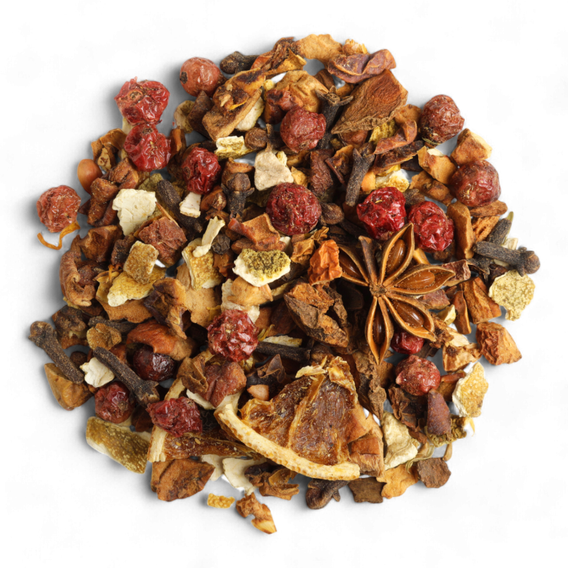 Morceaux De Pomme*, Écorces D’Orange*, Morceaux De Cannelle*, Anis Étoilé*, Clous De Girofle*, Quartiers D’Orange*, Groseilles*, Poivre Noir*, Fleurs De Souci*, Arôme Naturel D’Anis.